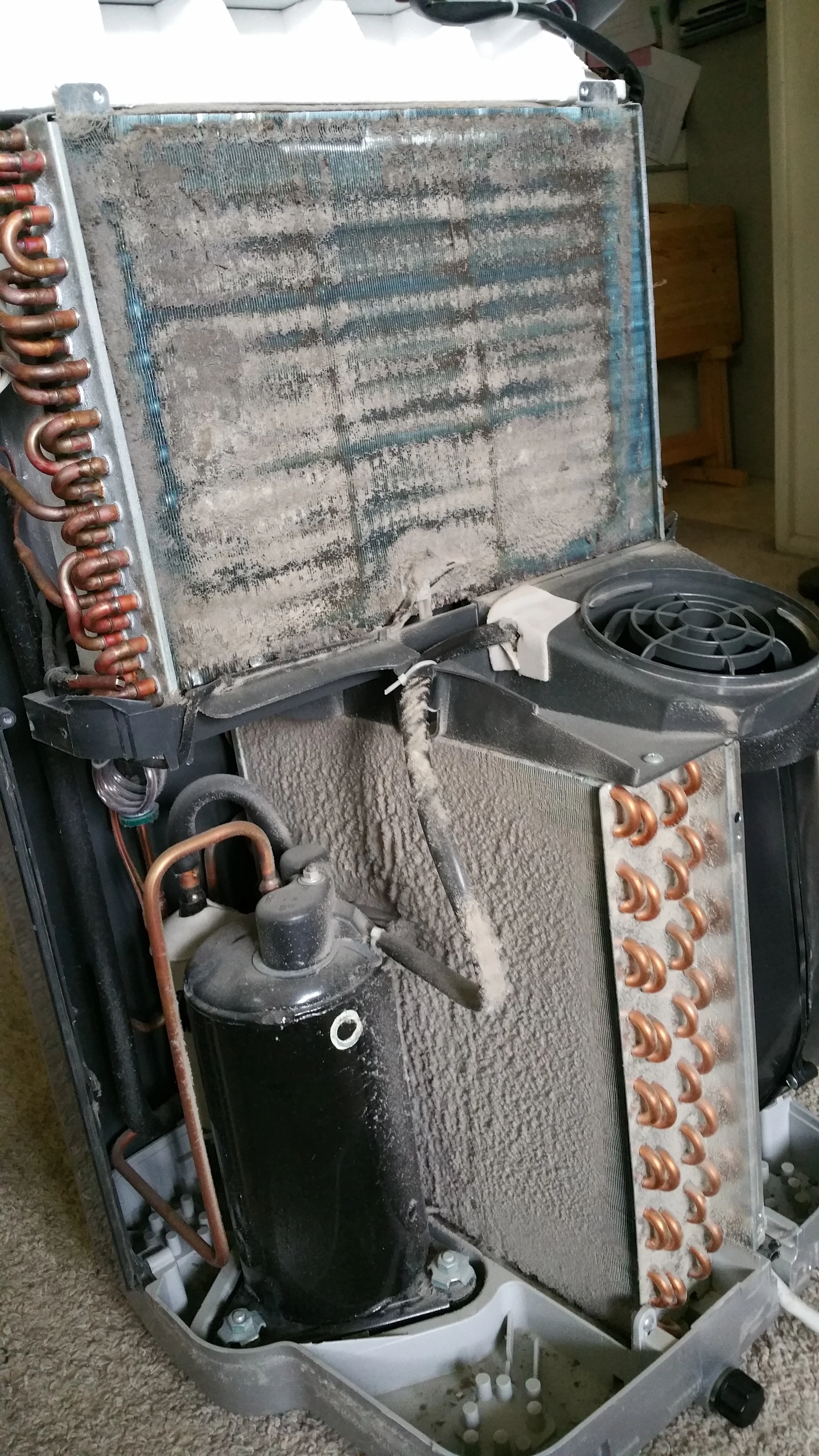 The air conditioner heaved a final sigh and the plastic case dropped away, revealing that not only was I right, but it was clogged even worse than I was able to see with the flashlight. A combination of brushing and blowing for about half an hour finally got the coil vents clear enough that I could see through them again. It wasn’t perfect, but with my limited tools it would have to do.