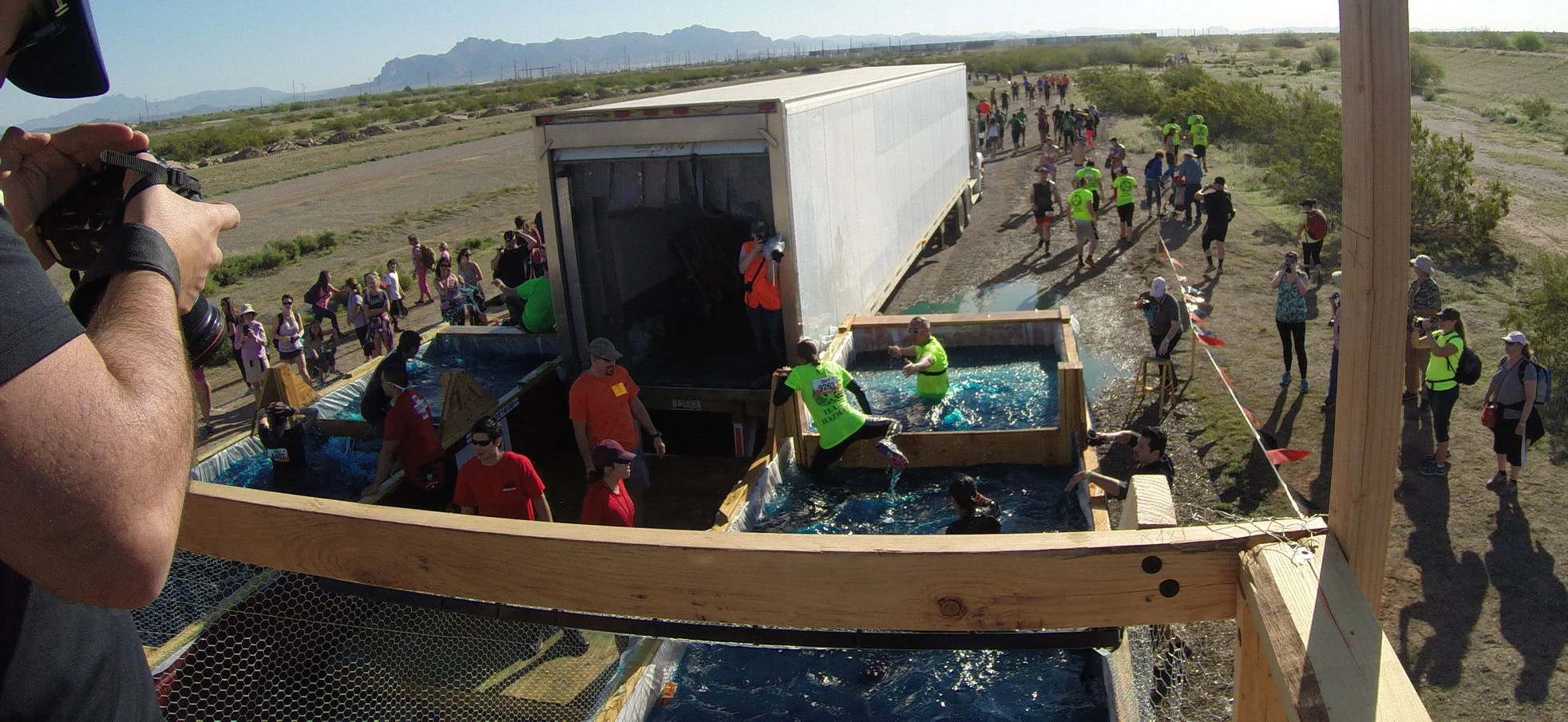 Arctic Enema 2.0: A giant trash dumpster is lined with plastic and filled ice cubes and topped off with water. A wooden divider is placed in the middle, rising about a foot above the water line. A semi trailer loaded with bags of ice is kept on hand to maintain extremity-shrinking temperatures. (34 degrees on average.) Entry into the obstacle is made by way of a slide that is covered by a section of chain-link fencing, forcing you to lay down. The idea is to slide in, help your teammates over the wall in the middle, and hop out of the other side. What actually happens is that as soon as you hit the water, the cold hits you back with a sucker punch to the gut. At this point all cognitive functions cease and you find you can leap over the wall and other participants using nothing more than your toes. When you make it out, be sure to take some time to apologize for any clawing, kicking, or drowning you may or may not have taken part in during the frothy melee.